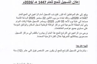 أعلنت وزارة الشؤون الإسلامية والتعليم الأصلي عن بدء استقبال طلبات التسجيل للمشاركة في القرعة الخاصة بحجاج العام القادم 1447 هـ، وذلك اعتباراً من يوم الإثنين المقبل. ووفقاً للبلاغ الرسمي الصادر عن الوزارة، فإن عملية التسجيل ستبدء في 22 سبتمبر الجاري وتستمر حتى 5 أكتوبر القادم، على أن تكون المراكز متاحة …